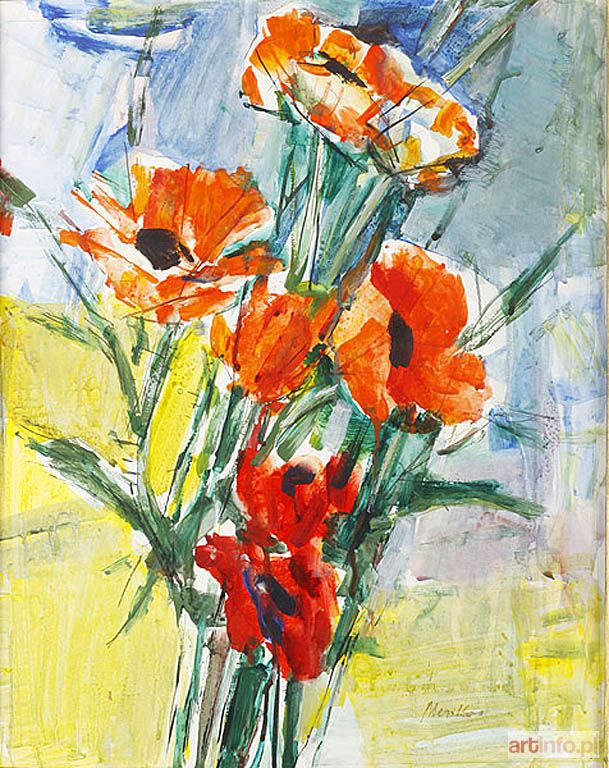 W prezentowanej martwej naturze przejawia się dobitnie dekoracyjny zmysł Menkesa, który w amerykańskim okresie jego twórczości przybierał coraz to nowy kształt. Świetlista, intensywna kolorystyka oparta jest tu na akordzie karminów, seledynów i błękitów, dopełnionym akcentami czerni i bieli. Pęk maków wydobyty został szybkim, dynamicznym duktem pędzla i zamaszystym konturem, miejscami uwalniającym się od plamy barwnej, gdzie indziej zanikającym. Linie kompozycyjne, jakie wyznaczają strzeliste, wiotkie łodygi polnych kwiatów układają się po diagonali. Duże podobieństwo stylistyczne do omawianej pracy wykazują obrazy "Red roses" i "Peonies" repr. w monografii Menkesa wydanej przez Lipert Gallery w 1993 r. (poz. 52 i 53).