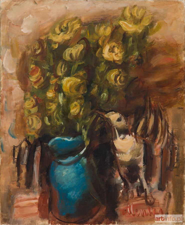 Martwa natura z bukietem kwiatów i ptaszkiem, lata 30. XX w.