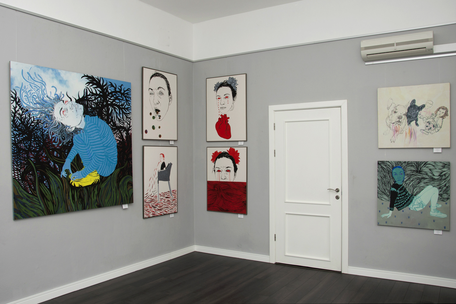 Bohaterką prac na papierach jest mała dziewczynka o dojrzałych rysach twarzy, psychodelicznym spojrzeniu, wypluwająca z siebie wrzecionowate elementy układające się w dekoracyjne desenie otoczenie. Sylwetka oddana jest w uproszczony i zarazem wymowny sposób. Zaledwie kilkoma bardzo trafnymi kreskami nakreślone zostały portrety, infantylne stroje ale też gesty, czy nastroje. Czasem postać zostaje zredukowana do głowy zestawionej z fragmentem wnętrzności, np. sercem; albo zlewającej się z ornamentalnie potraktowanym tłem. W pracach na papierach dominuje czerwień kontrastująca z czarną kreską bądź plamą oraz biało-kremowym naturalnym tłem kartonu. Kolorystyka uwypukla drapieżność rysunków. Większość scen osadzona jest w surrealistycznej, mocno niepokojącej rzeczywistości. Malowane są pewną kreską, jakby „od jednego rzutu“. Syntetyczne i dosadne ujęcia działają bardzo wymownie. Czujemy w nich obecność wnikliwie przyglądającej się sobie artystki ale też prowokację do pochylenia się nad kolejnym etapem jej twórczości.