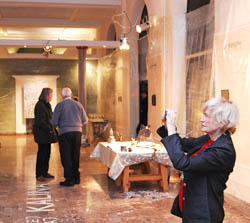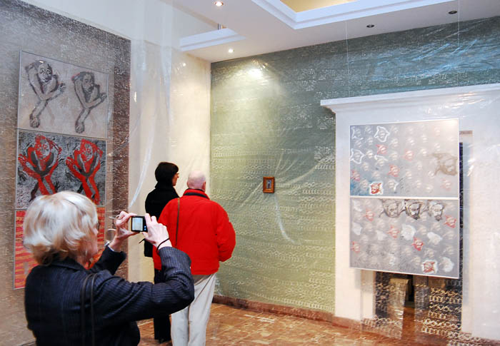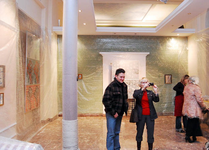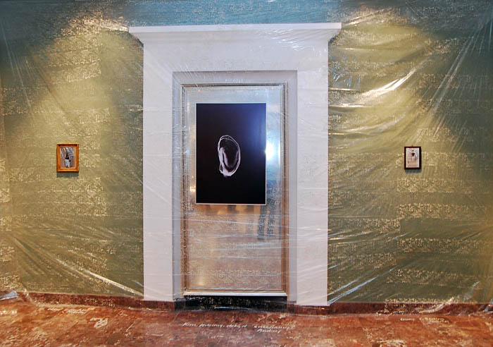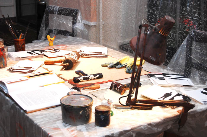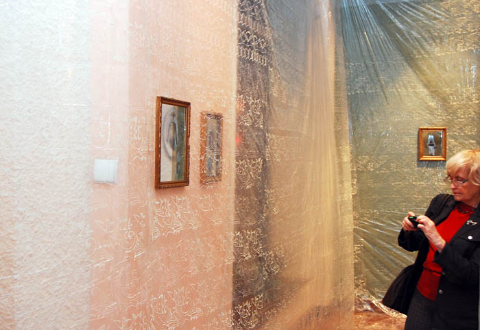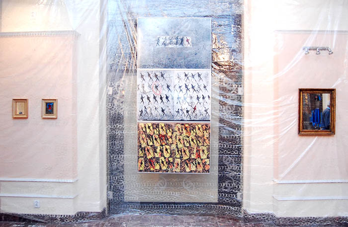 Punktem wyjścia pokazu jest pomysł na zapakowanie wnętrza w materiał zgrzebny i najprostszy, jakim jest przezroczysta folia z nadrukowanym "z wałka" wzorem, celowo wywołującym skojarzenia z mieszczańskimi wnętrzami kamienic, gdzie takie ozdoby malowano na ścianach klatek schodowych i we wnętrzach salonów, a w sypialniach nadrukowywano je na tapety. Całe pomieszczenie, przeładowane atrybutami, udaje pracownię artysty. To wielokrotnie przywoływany motyw w sztuce, malowany i rysowany przez wielu twórców, będący dla artysty alternatywą dla autoportretu, w momencie konieczności twórczej przerobienia autotematyzmu. W wypadku Kalinów motyw ten użyty został trochę prześmiewczo i w ewidentnej grze z widzem oraz z jego wyobrażeniem o ekscentrycznym wnętrzu artystycznym, "twórczym nieładzie", słynnych pracownianych biesiadach w otoczeniu półnagich modelek. Na wernisażu artystyczno-ludyczną atmosferę, podkreślała akordeonowa muzyka w duchu przedwojennej warszawskiej biesiadności, a celową kiczowatość całości, doskonale uzupełniał tłum mniej lub bardzie zaprzyjaźnionych z artystami gości, którzy idealnie podchwycili "klimat".