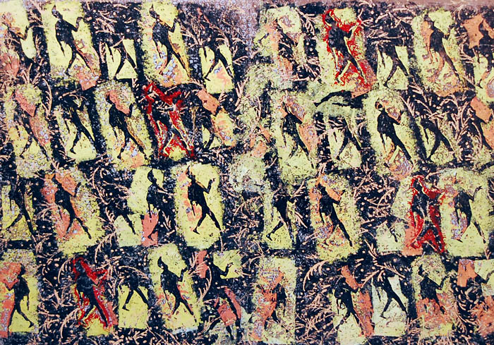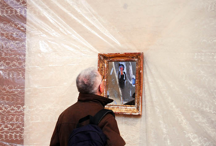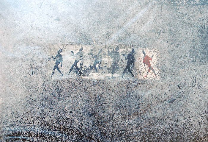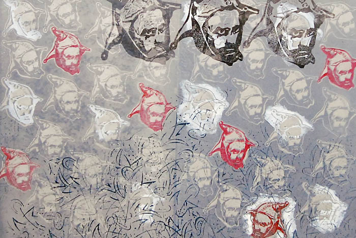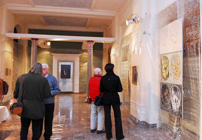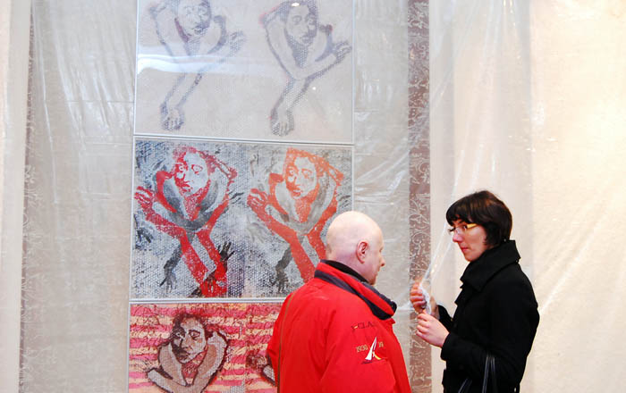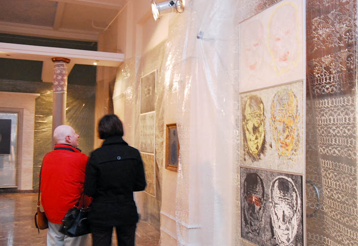 W opisanej aranżacji funkcjonują prace obu artystów, płynnie wpisując się w ten wymyślony kontekst poprzez zastosowanie wspólnego materiału i praktyki estetycznej. Andrzej Kalina prezentuje zmultiplikowane portrety odbijane na folii z tradycyjnej matrycy linorytu. Ich bylejakość i sztuczność oraz wpisana w nie programowa nietrwałość i grożba destrukcji podkreślają chwilowość obeności w naszym życiu. Nakładając ten sam obraz na różne podłoża autor uzyskuje przedstawienia od subtelnych ledwie widocznych sylwetek w szarościach, bielach i czerniach, po bardzo kontrastowe znaczone intensywnym kolorem. Do jednolitych przedstawień dodaje te wyróżniające się kolorem, układem, kształtem, wprowadzając do kompozycji element napięcia, niepokoju, burząc zastany porządek. Grafiki te mają odniesienia do naszej mieszczańskiej mentalności codzienności, w której wielokrotnie opakowanie staje się ważniejsze od jego zawartości, a zasada "postaw się, a zastaw się", szczególnie w okresie przedświątecznym staje się niezwykle popularna.