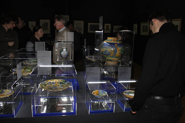 Wystawa ukazuje związek majoliki renesansowej w stylu "istoriato" (narracyjnym) ze sztuką Rafaela i jego uczniów. Włoscy garncarze tworząc na naczyniach sceny mitologiczne, historyczne oraz religijne inspirowali się przede wszystkim sztuką tego wybitnego artysty. Dlatego też majoliki ozdabiane scenami narracyjnymi zaczęto powszechnie nazywać ceramiką Rafaela. Prezentowane na wystawie naczynia są dziełami tak wybitnych malarzy majolik, jak Nicola da Urbino, Xanto Avelli da Rovigo, Francesco Durantino czy Fontany. Ponadto pochodzą z najważniejszych w okresie Renesansu ośrodków garncarstwa, m.in. Fenzy, Deruty i Gubbio. Najstarsza majolika znajdująca się na wystawie powstała ok. 1510 roku, najpóźniejsza - w XIX wieku (datacja kilku XIX-wiecznych naczyń wynikła dopiero podczas badań prowadzonych przed wystawą).