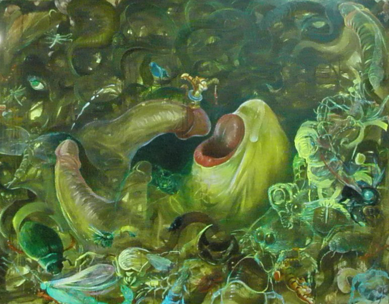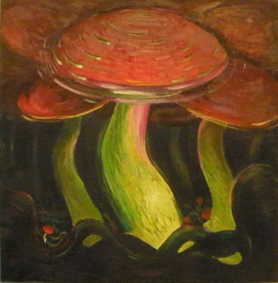 Do ryzykantów mogę zaliczyć Pawła Dunala, kolory jego obrazów przypominają rozlaną zupę i może nie są najdelikatniejsze, ale cenię jego odwagę. W końcu żeby namalować zwariowane muchomory w lesie trzeba mieć trochę wyobraźni.