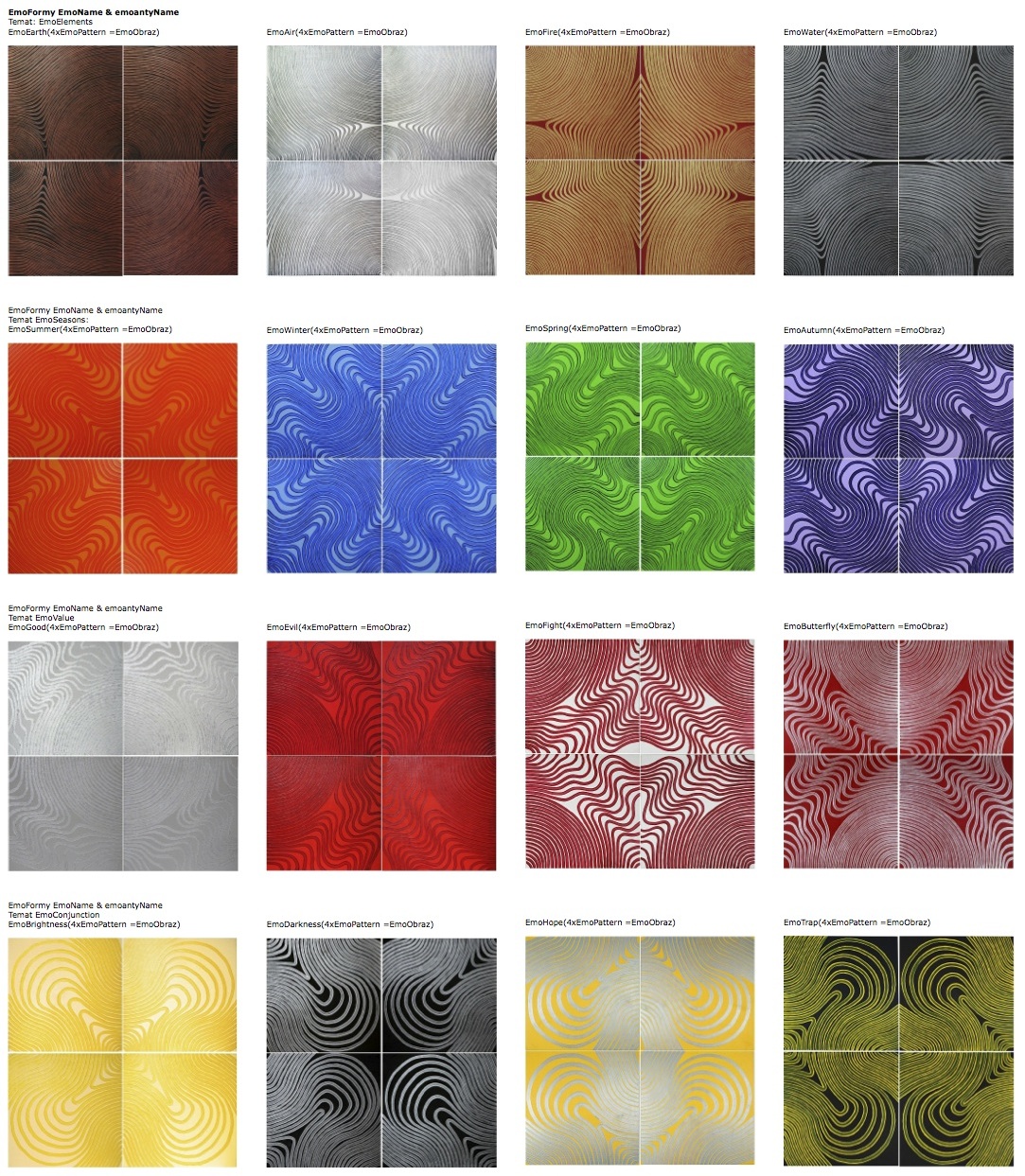 Wszystkie dzieła mają format kwadratu. Prezentowane są w zestawach składających się z czterech obrazów, tworząc taki sam kształt geometryczny. Jest to zapewne celowy zabieg, przemyślane działanie autorki, w którym można doszukiwać się znaczeń symbolicznych. Kwadrat symbolizuje sferę wewnętrzności - tego, co jest związane z człowiekiem i ziemią (cztery strony świata). Krzyż jako symbol to powiązanie nieba i ziemi, nieświadomości