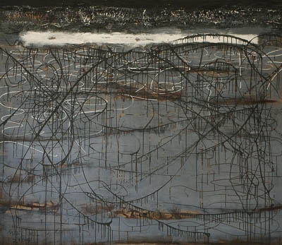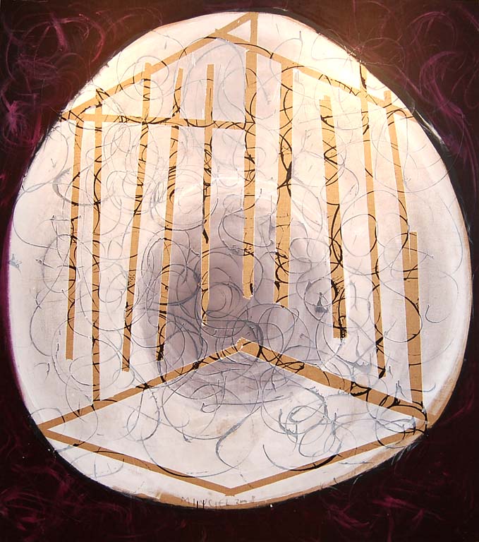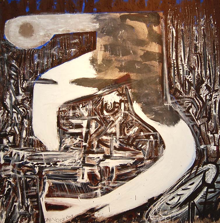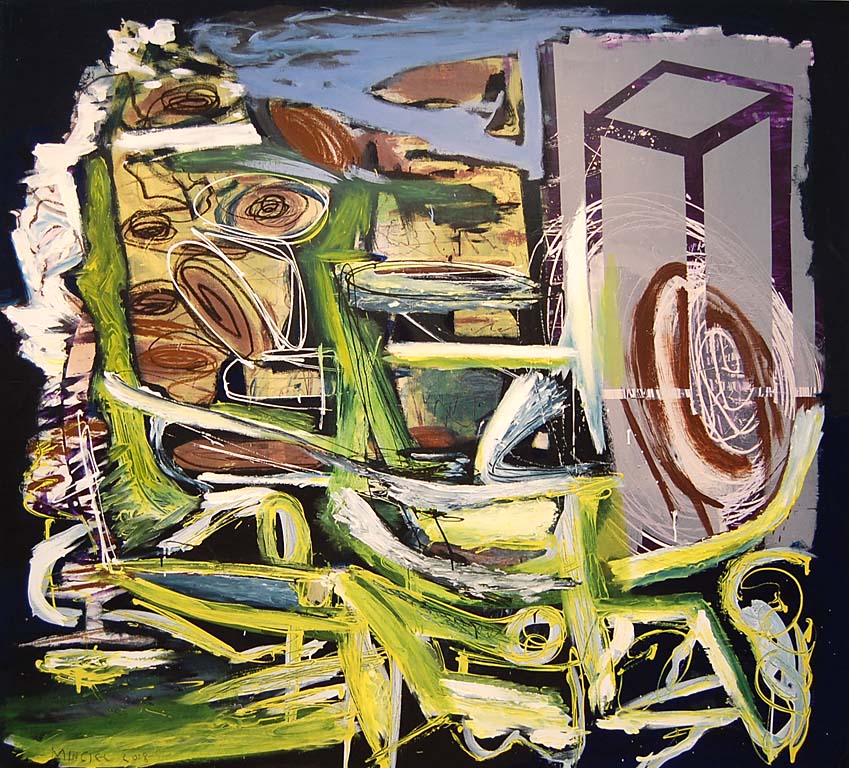 Energia zawarta w kolorze, jest siłą napędową obrazów. Ma się wrażenie, że prace są żywą tkanką, która pulsuje barwami. Geometryczne kształty to gesty artysty, jego sposób na wyrażenie emocji. Format prac również buduje napięcie, ogromne obrazy przyciągają uwagę (185x180, 206x270).