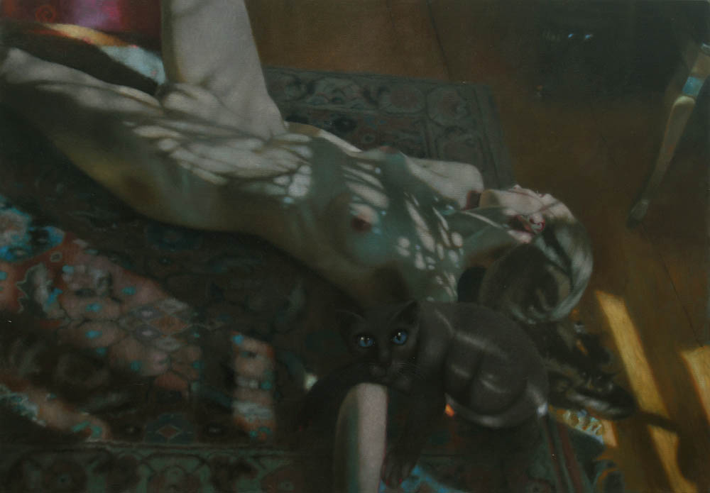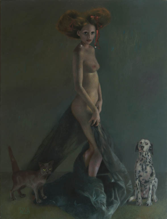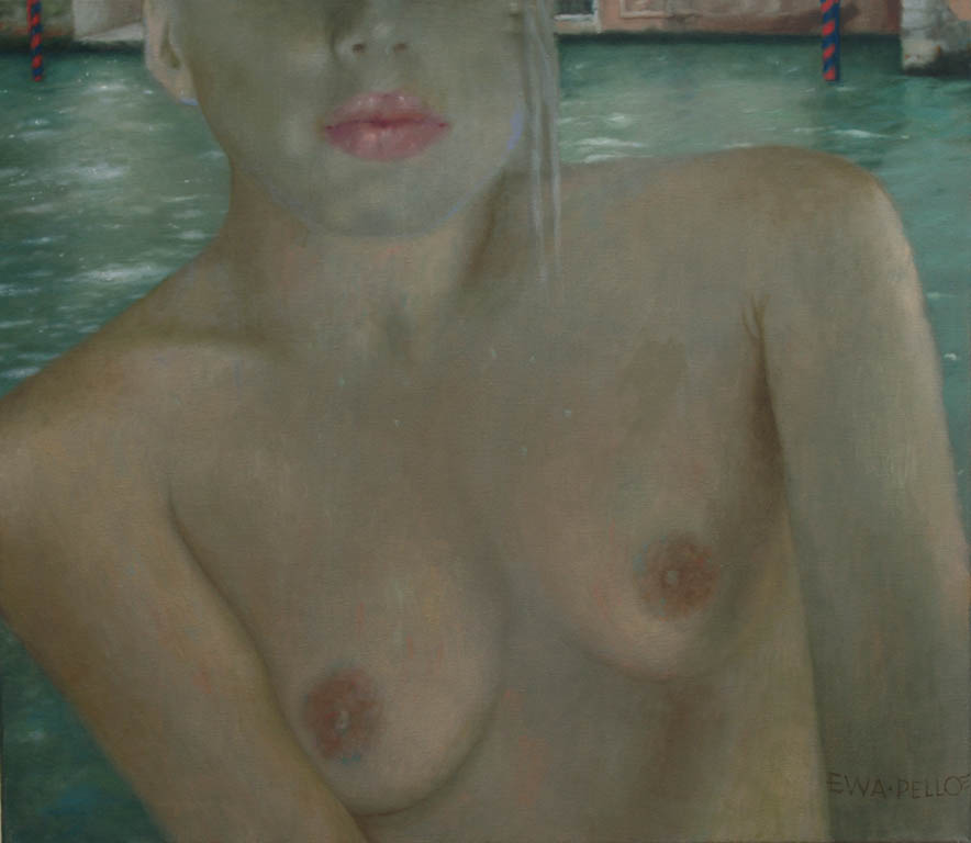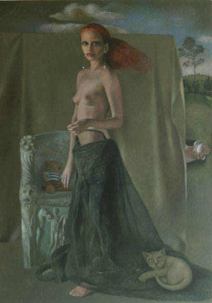 Ewę Pello interesują przede wszystkim dwa tematy - akt kobiecy we wnętrzu i martwa natura. Chętnie je łączy, zaludniając jednocześnie powierzchnię płócien tajemniczymi postaciami kotów, które często patrzą się wprost na widza, sygnalizując swoją dezintegrację z przedstawianym motywem i odrębność w obrębie obrazu. Są tu znakiem tajemnicy, pozwalającym traktować kompozycje artystki umownie i nieco nadrealnie. Dzięki nim odbieramy w sposób dojmujący senną atmosferę przesyconą zapachem perfum i rozpoznajemy niecielesność i nieuchwytność snujących się po pomieszczeniu nagich, szczupłych i zwinnych kobiet, które nie mogą stać się obiektami erotycznego uniesienia, gdyż są nazbyt niedosłowne.