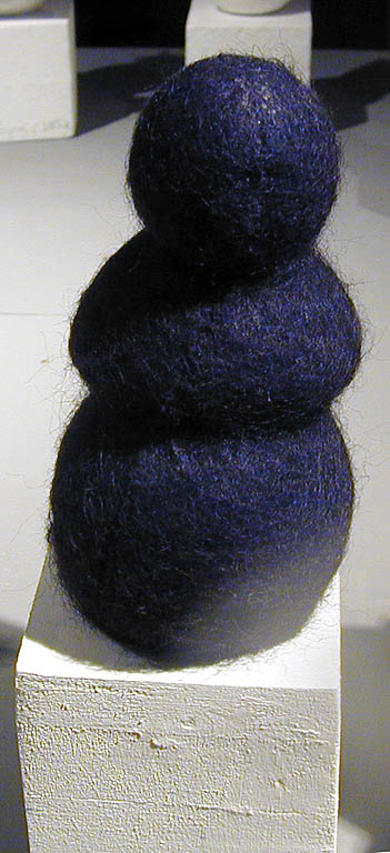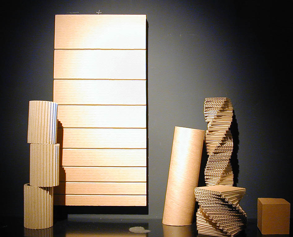 Grażyna Bartnik zajęła się nobilitacją jednego z najbardziej podłych materiałów - kartonu. Takiego kartonu, z jakiego robi się pudła do pakowania. Dwie karty sztywnego papieru, a pomiędzy nimi karbowane, delikatne rureczki wypełnione powietrzem. Po rozcięciu to bogactwo faktury i światłocieniowych efektów. Nieograniczone możliwości.
