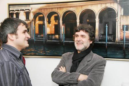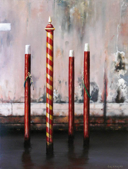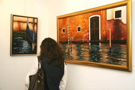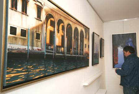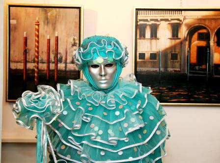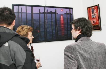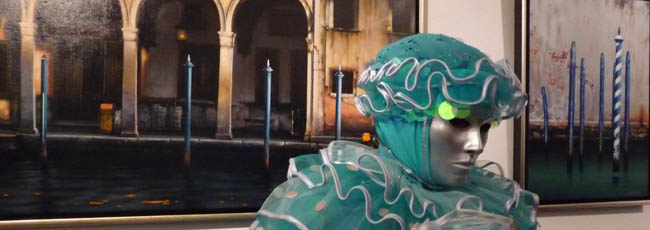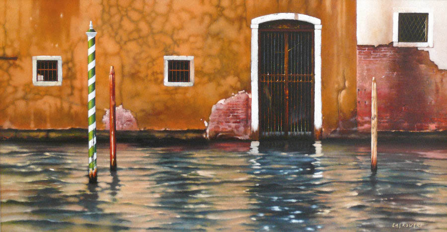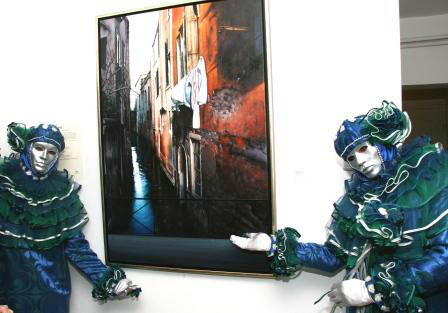 Artysta zafascynowany specyficznym klimatem miejsca stworzył obrazy- wspomnienia: „Stare dostojne budowle, pamiętające czasy dożów, koronkowe pałace odbijające się w wodzie kanałów, pasiaste pale i paliki z przymocowanymi gondolami, gołębie na placu Św. Marka, refleksy światła w zaułkach kanałów (…)” , o czym czytamy w katalogu towarzyszącym wystawie.