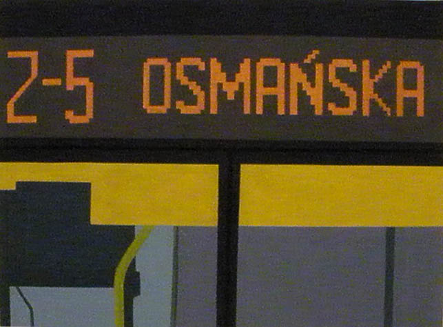 Igor Przybylski maluje środki lokomocji. Po fascynacji pociągami tym razem są to autobusy, a raczej ich czoła i numery. Są też fragmenty przystanków, a nawet kasownik.