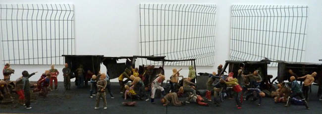 Tomasz Kulka wnikliwie obserwuje subkulturowe życie rodzinnego Wolbromia. Penetruje obszary zdewastowane, odnajduje ślady degradacji tkanki miejskiej. Na niedawnej wystawie w Centrum Rzeźby Polskiej w Orońsku pokazał grupową bijatykę - “ustawkę”. Kilkadziesiąt figurek z malowanej porcelany skłębiło się w brutalnej walce. Na obecnej wystawie Kulka rozbudowuje tę scenę dodając kolejne postaci, kolejne sytuacje. Przy czym każda postać ma indywidualne cechy a żaden gest, żaden moment nie powtarzają się. Obok, również wykonane z porcelany, przykłady owej zdegradowanej architektury: zabazgrane garaże, zdemolowany kiosk, połamany przystanek, odwzorowane w najdrobniejszych szczegółach. Patrząc na te obiekty, przyglądając się “ustawce”, widz czuje się jak Guliwer w kraju liliputów bez reszty pochłoniętych okrutną, bezlitosną walką.