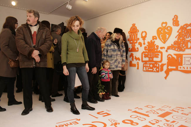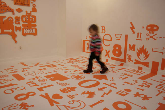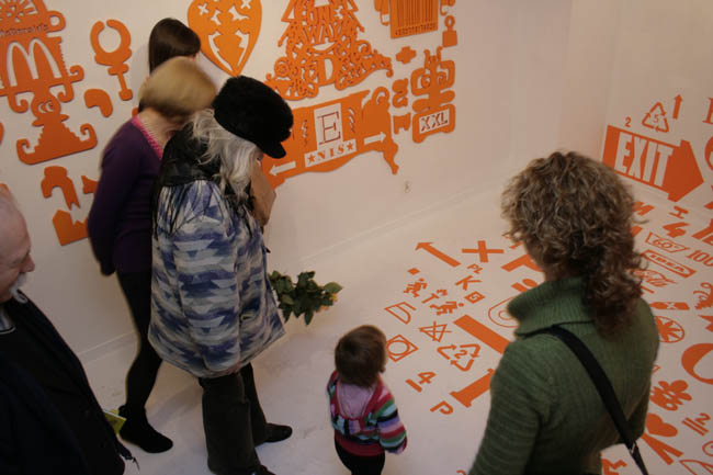 Białe pomieszczenie, wściekle pomarańczowe wlepki na podłodze i ścianie prezentujące znaki ostrzegawcze, które zostały przerobione przez artystę. Bawił się ich formą nadając im często śmieszne znaczenie. Zauważa, że znaki pozbawione oryginalnego kontekstu zatracają znaczenie. Interesuje mnie bardzo materiał, z którego wykonuję prace - folia samoprzylepna, przez którą prace stają się jednorazowe, bo nie można ich wykorzystać ponownie.