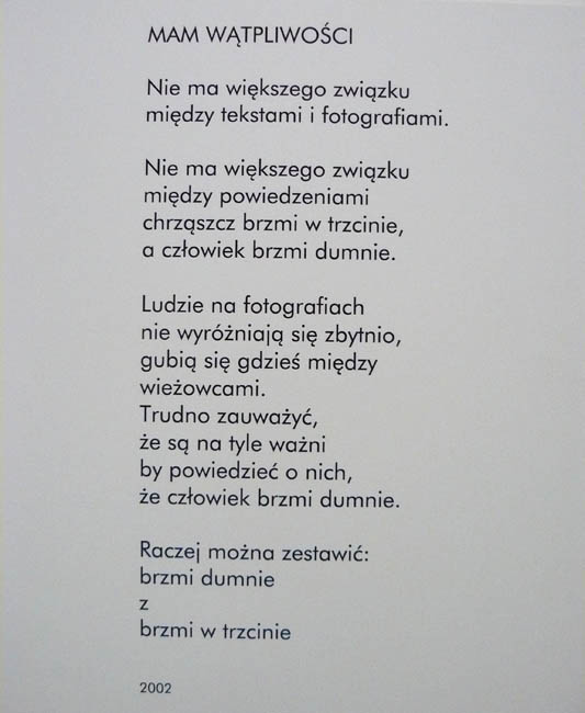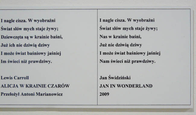 Na wystawie zgromadzono prace począwszy od lat 70. (m.in. Stale mówimy o człowieku, 1978, Mielnik, 1981, W porządku/ It’s O.K, 1994, Anomia, 1998), po najnowsze (Mam wątpliwości, 2002, Jan in Wondeland, 2009). Kurator wystawy, Grzegorz Borkowski, skupił się na działaniach z fotografią i tekstem . Jeśli chodzi o fotografię Świdzińskiego, podobnie jak konceptualistów, nie interesują jej walory estetyczne, jest to dla artysty kompletnie nieistotne. Ważne jest badanie rzeczywistości poprzez włączenie fotografii do reprezentacji przedstawienia. Integralną częścią zdjęć są napisane do nich teksty lub mówiony performance. Taka wypowiedź nie jest po prostu komentarzem, to raczej interwencja poddająca wybrany konkret przekształceniu w nowy fakt - jak mówi tekst do wystawy. W pracach tych Świdziński, świadomy wielości kontekstów, przedstawia dany fakt przefiltrowany przez swoje “ja”, a więc przez pryzmat własnego kontekstu. I tak na przykład praca W porządku (1994) ukazuje gazetowe zdjęcie żołnierzy z wytłuszczonym napisem “Our readers see the news...” , być może dla niektórych fotografia ta będzie po prostu informacją o działaniach wojennych, może ktoś dostrzeże tu przede wszystkim imperialistyczne dążenia USA, dla Świdzińskiego najważniejszy jest w każdym razie martwy człowiek, nad którym pochylają się żołnierze. Jednak, jak podkreśla artysta, jego wykładnia nie jest tu bynajmniej jedyną słuszną. Każdy odbiorca w zetknięciu z pracami twórcy tworzy swoją własną interpretację, podług własnego kontekstu.
