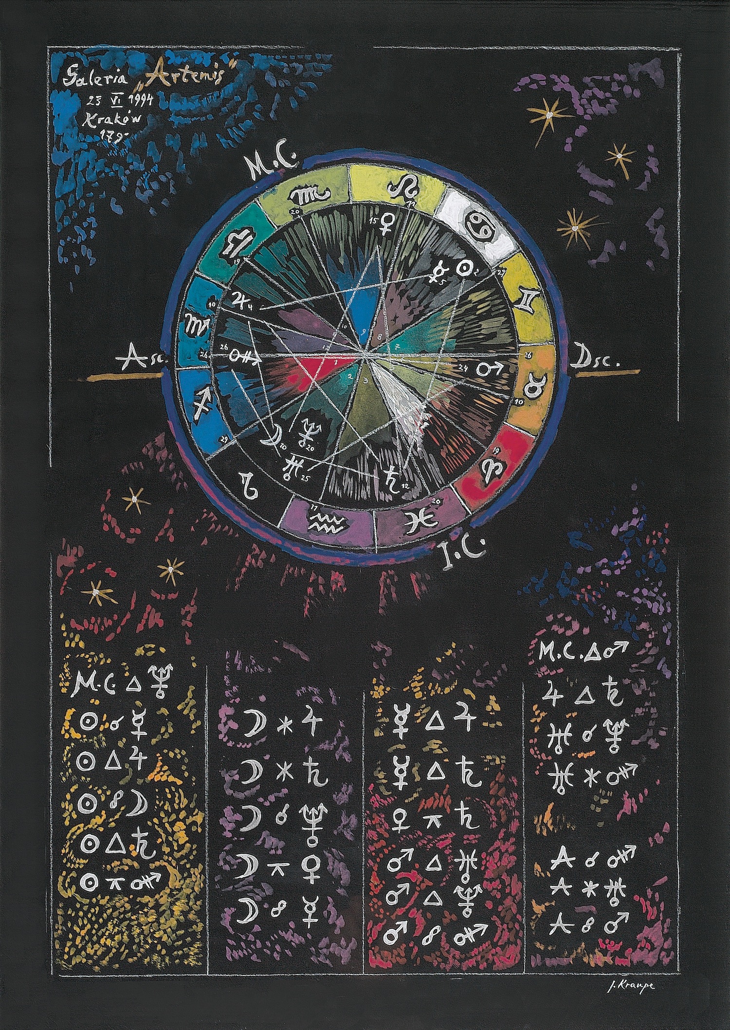 Profesor Janina Kraupe została poproszona o wystawę dedykowaną dwudziestoleciu działalności galerii Artemis. Nestorka krakowskiego środowiska sztuki pomogła zaistnieć galerii, w czerwcu 1994 roku, firmując rangą swojego nazwiska pierwszą wystawę. Sporządziła też, zapowiadający pomyślność, horoskop. Tym razem pokazuje Nowe obrazy - wybór z powstałych w tym i ubiegłym roku prac. Wystawa emanuje niezwykłą aurą, co odwiedzający przypisują pozytywnej energii, którą Janina Kraupe zawarła w tych prezentowanych obrazach. Są to dojrzałe i wysmakowane kolorystycznie kompozycje stworzone z ogromną swobodą i świadomością. Są prawdziwym hymnem radości z ich tworzenia i nie mającego granic warsztatu autorki. Przemawiają do odbiorców zarówno urodą plastyczną, jak i filozoficznym i egzystencjalnym przesłaniem.