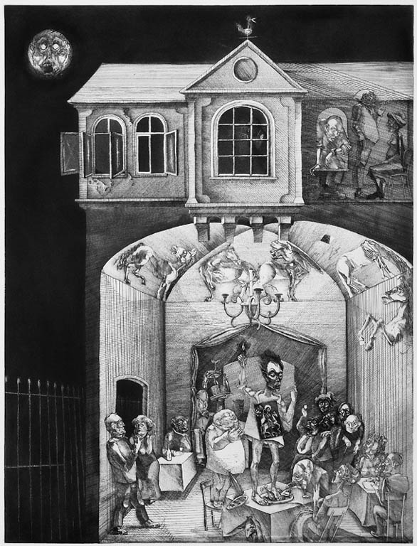 „Mistrz i Małgorzata” Michała Bułhakowa należy do arcydzieł literatury XX wieku. Przenikają się tam światy stalinowskiej Moskwy i chrystusowej Jerozolimy, a na tle tego wszystkiego obnażona zostaje kondycja ducha ludzkiego. Odwieczna walka dobra ze złem zmieszana z absurdem i satyrą niekoniecznie niesie optymistyczne przesłanie. Króluje zło, wszelkie wyższe uczucia o prawo swego bytu muszą toczyć nieustanny bój. Tak w świecie, jak i w każdym z nas. Te uniwersalne wartości powieści stały się punktem wyjścia dla Kacpra Bożyka. Wykonane przez niego grafiki, podobnie jak w powieści, „dzieją się” w różnych płaszczyznach. Niezwykle precyzyjne, operują aż do przesady misternym szczegółem, ujmując jednocześnie w sposób syntetyczny główne problemy moralne, znane już z powieści. Celność wyrazu wyłania główną anegdotę i symbolikę przedstawień z pozornego chaosu. Pojawiają się oczywiście czarne koty (Behemoty zapewne), ale też przedmioty, które zgodnie z barokową tradycją, symbolizują kruchość życia, ulotność i zmienność losu. Rozrzucone karty do gry, płonące świece, czaszki i ludzkie szkielety to swoiste memento mori we współczesnym wydaniu. Ta precyzja przedstawień i misterność oddania szczegółu nasuwa oczywiste skojarzenia z holenderskim malarstwem rodzajowym XVII wieku. Podobny bogaty zestaw rekwizytów, z których każdy jest rebusem, kryjącym najczęściej moralne przesłania. Idąc tą droga możemy sięgnąć w jeszcze bardziej odległe czasy, do Dürera, i skojarzyć jego graficzne przedstawienia Czterech Jeźdźców z jeźdźcami niesionymi na grzbiecie szkieletu konia w jednej Wielowątkowość grafik Bożka.