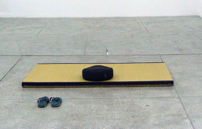 Jednak reszta prac utrzymana jest w kontemplacyjnym charakterze. Mówi o tym wprost znajdująca się w centrum przestrzeni wystawy tytułowa praca Mnich, która zachęca do „zanurzeniu się we własnym ja”. Składają się na nią: mata, położona na niej poduszka, klapki oraz wygięta blaszka, która od wielu lat symbolizuje, jeden w z najważniejszych symboli w sztuce Kamoji - wodę. Artysta obficie czerpie z japońskiej kultury, z której pochodzi – w cyklu Projekty ogrodu nawiązuje do tej niezwykle ważnej w kraju kwitnącej wiśni działalności kształtowania przestrzeni. Kamoji ma bardzo subtelny repertuar środków formalnych, ale zawsze są one znaczące, jak w przypadku kamyków, których używa w opisywanym wyżej cyklu, a które także pojawiają się w pracach z serii Małe obrazy - Naczynie może być proste.