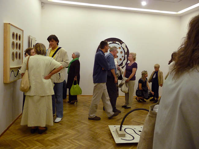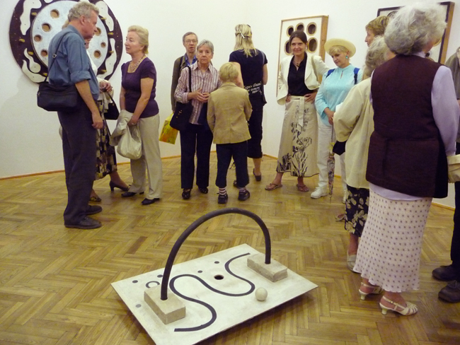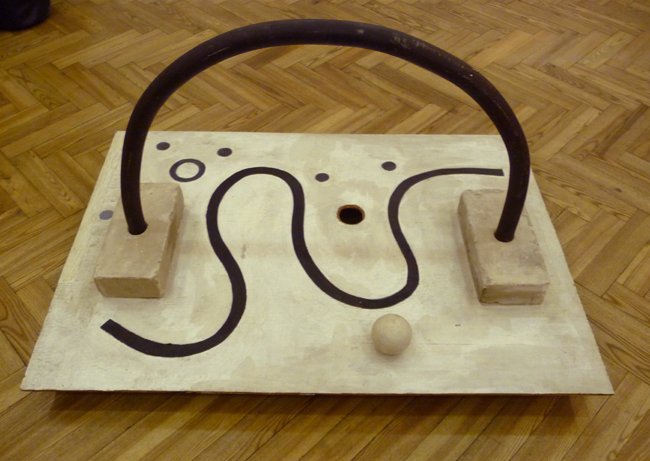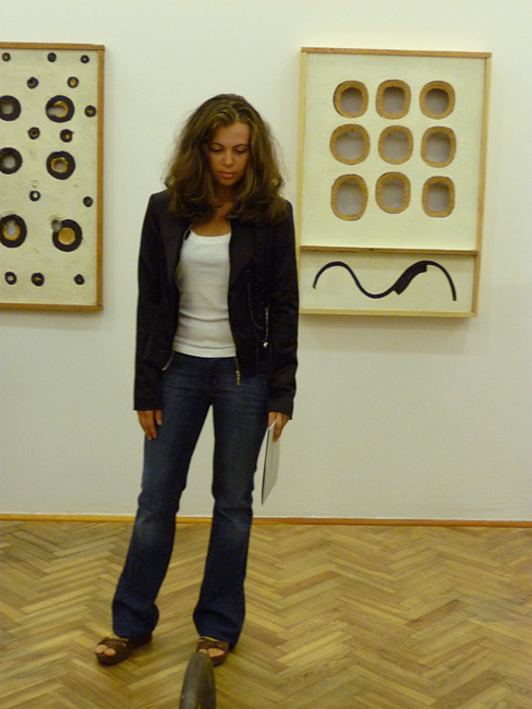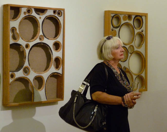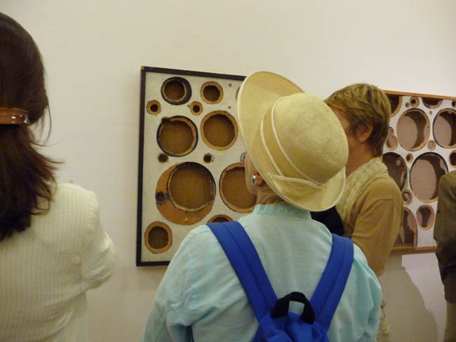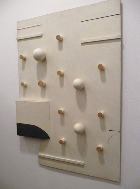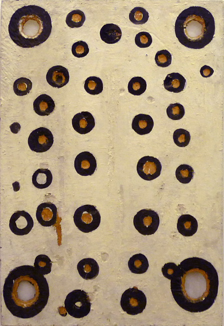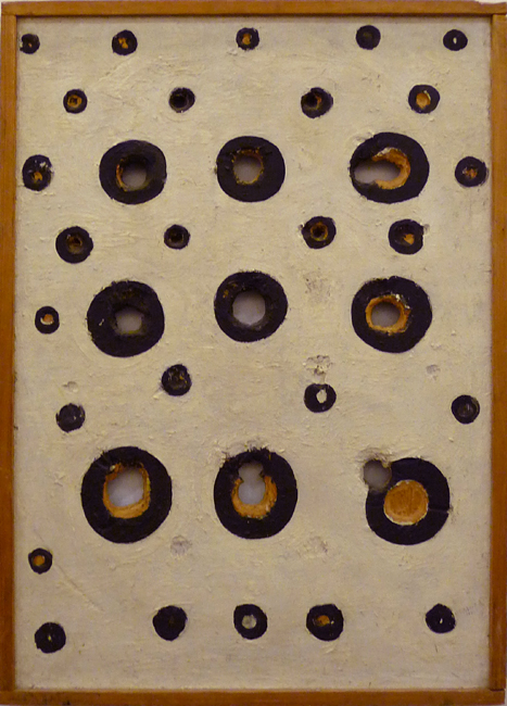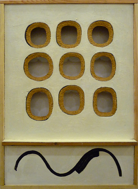 Są to realizacje młodego wówczas artysty, dla którego praca twórcza była oderwaniem od doświadczenia trudnej rzeczywistości. Artysta wypowiadając się poprzez obraz wykracza poza dwuwymiarową płaszczyznę ku przestrzeni. Kamoji wprowadza odpowiedni porządek, z ogromną dbałością wybiera materiał, z którego tworzy lapidarne, syntetyczne w formie kompozycje. Realizuje naścienne reliefy oparte na prostych geometrycznych układach, a ich wizualne dopełnienie, rekonstrukcję w przestrzeni odnajdujemy w umiejscowionej centralnie, na podłodze, rzeźbie zatytułowanej Tęcza (1967). W eksponowanych wewnątrz sali wystawienniczej pracach artysta stopniowo redukuje lica obrazów poprzez wydrążanie, powielanie i zwiększanie otworów o homeomorficznych kształtach. W efekcie uzyskuje obrazy-reliefy ze zróżnicowanym natężeniem fakturowym, z ograniczoną kolorystyką do czerni i bieli.
