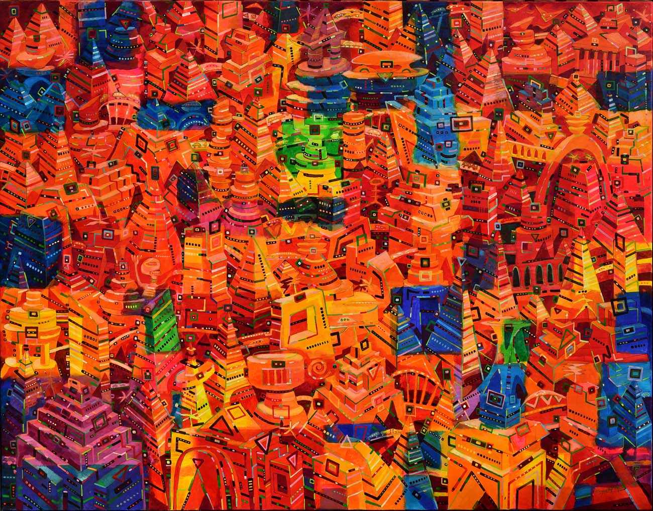 Jego wielowątkowe, pulsujące obrazy, grafiki, fotografie łączą abstrakcyjne formy z organicznymi i geometrycznymi konturami, urzekają kolorystyką, nieograniczoną paletą barw. Sprawiają wrażenie, że pochodzą z innych, pozaziemskich cywilizacji. Z rozwagą mówią o istocie i sensie istnienia, potrzebie poznawania natury i mechanizmów życia; ostrzegają przed burzeniem ładu i porządku zastałych struktur. Są zapisem doznań i oczarowań, wzruszeń i irytacji. Stanowią bardzo osobiste, przekonywujące odczytanie metafizycznego i egzystencjalnego wymiaru rzeczywistości. Są wśród nich obrazy „świecące”, zaczarowane, odkrywające swoją piękność w blasku światła ultrafioletowego. Urzekają niezwykłymi, efektownymi impresjami ujawniającymi wszystko to, co w świetle normalnym, dziennym jest niewidoczne, odległe jak kosmiczne mgławice, konstelacje gwiezdne.