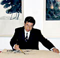 Wielką atrakcją dla licznie zebranej publiczności był pokaz malowania tuszem w wydaniu artysty. Rozłożone na stole pędzle, pędzelki, szpatułki, miseczki z tuszem i nieznane bliżej akcesoria dawały wyobrażenie o warsztacie artysty. Liou Ping-hen nakładał kolejne plamy, łamał barwę, rozprowadzał tusz po kartonie szybkimi ruchami, wyłaniając z chaosu barw tajwański pejzaż.