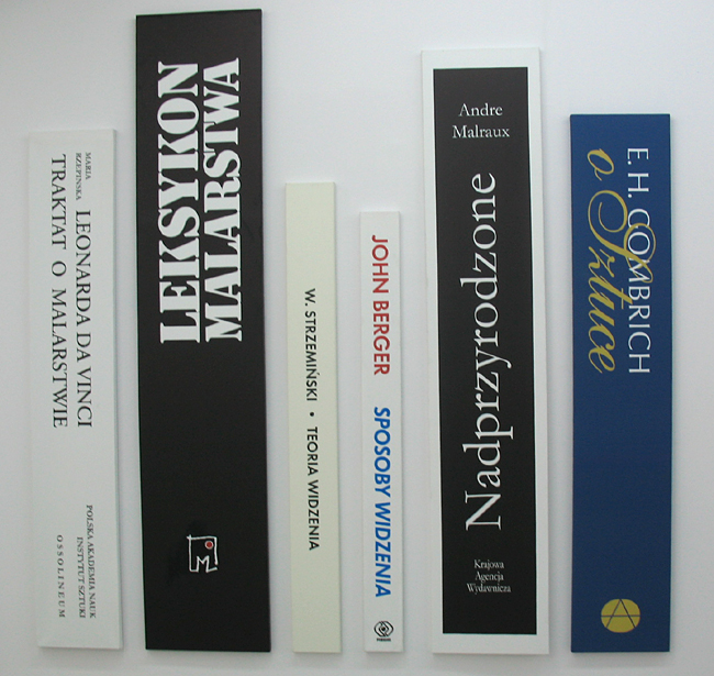 Wystawę otwierają prace nestora polskich malarzy piszących – Pawła Susida. Jego, jak zawsze, intelektualne i refleksyjne płótna, to mocny punkt ekspozycji, podobnie jak instalacja Jadwigi Sawickiej. Praca artystki od razu „wpada w oko”, a to za przyczyną, kolorowych, migoczących lampek, które przeplatają się z charakterystyczną różowo-cielistą taśmą, na której wypisane zostały powtarzające się hasła: „dojrzała, zmysłowa, nasycona” i „podatna, mięsista, gruba”. Tymi słowami opisuje Sawicka „Materię malarską”, jak stanowi tytuł tej instalacji. Zgoła niemalarskie są prace Ciecierskiego – to seria rysunków nowych oraz z wcześniejszych lat. Tautologiczny zabiegieg zastosowany przez autora, w którym napisanym słowom odpowiadają ich obrazkowe równoważniki, porusza kwestię znaczenia i jego reprezentacji. Z kolei Kuskowski malując powiększone grzbiety książek z zakresu historii sztuki dokonuje identyfikacji przedmiotu z malarstwem, jednocześnie ją demaskując.
