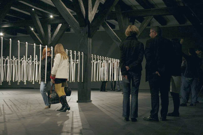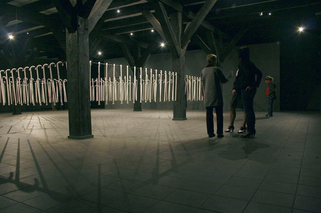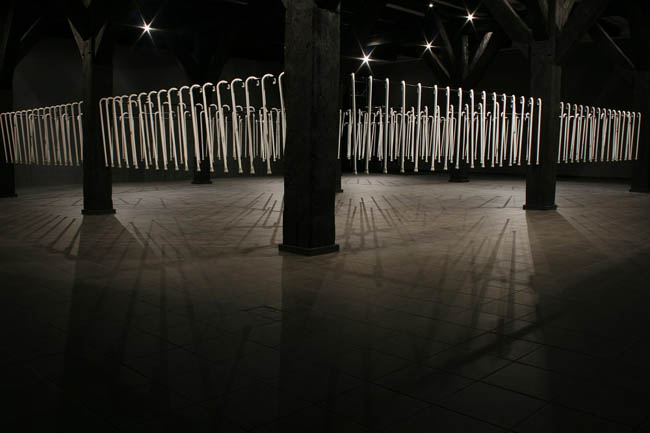 Instalacja site specific Biały cień, z serii Long Life Learning, jest swoistym apogeum zastosowania lasek jako środków wyrazu. W przestrzeni między charakterystycznymi drewnianymi słupami „unoszą się” setki lasek, przypominających te używane przez niewidomych. "Wnętrze jest więc wypełnione substytutami wzroku, którymi posługują się niewidzący, a ich ogromna liczba stawia odbiorcę w niecodziennej sytuacji, w której konfrontacja z tymi instrumentami dotykowego „widzenia” czy protezami, pomocnymi w rozpoznawaniu otoczenia przez ślepych skłania do namysłu nad sposobami percepcji rzeczywistości i zwraca uwagę na sensomotoryczny aspekt tych procesów. Uruchamia się inne widzenie, przekraczające to, co widzialne, na rzecz tego, co wewnętrzne, dotykowe, cielesne i tym samym ukazujące te kategorie postrzegania świata, które na co dzień pozostają uśpione." (Marta Smolińska, fragment eseju z katalogu wystawy)