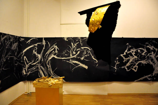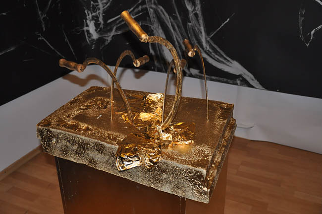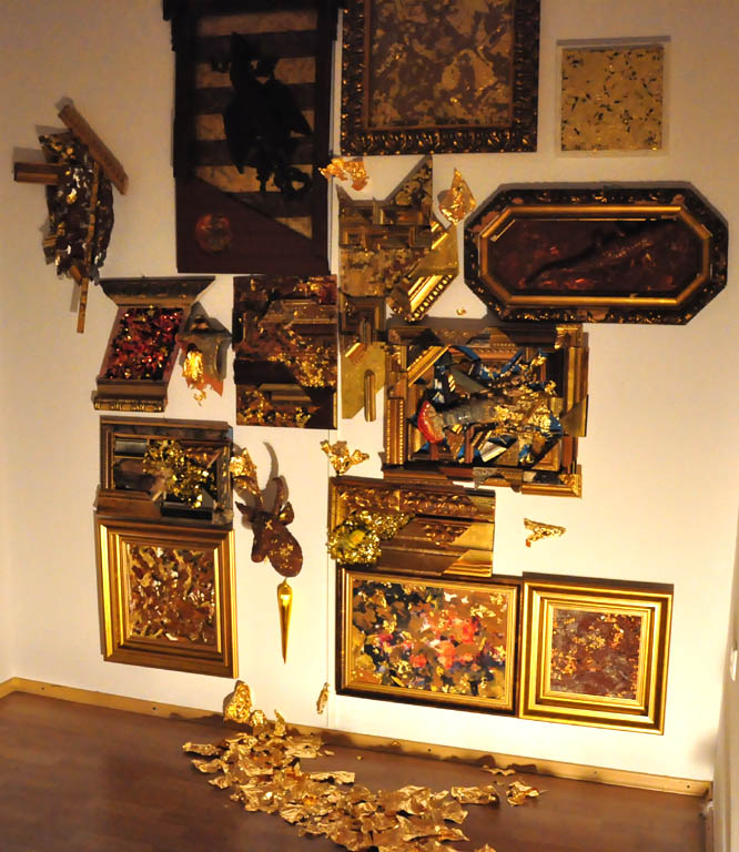 Think Crazy Rococo to wystawa przewrotna. Galeria staje się obiektem artystycznym a zarazem miejscem, gdzie pokazywana jest sztuka. Złote drzwi galerii są zaproszeniem do rozkoszowania się przepychem. Wchodzimy do galerii-obiektu, gdzie przekraczamy próg surrealnego świata, pełnego teatralnych rekwizytów. Z jednej strony nasuwa się myśl, że ocieramy się o kicz, obiekty toną w złotych papierkach, wyciągniętych z pudełek po czekoladzie. Ustawione światło, wydobywa w złocie, przedziwne przedmioty: muszle, langusty, bombki choinkowe, plastikowe muchy, pająki, krokodyle a nawet głowę kozła.