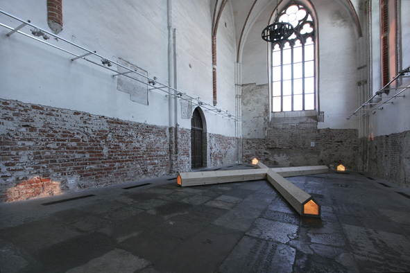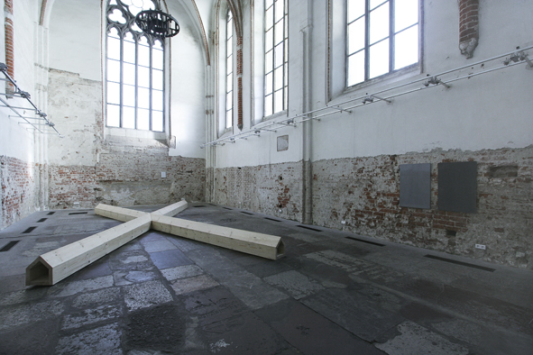 Nicolai Angelov pokazuje dwa monumentalne obiekty; jeden zbudowany w nawie głównej - wyobrażenie schodów do epitafium Jungschultza, drugi w prezbiterium - zdeformowany krzyż. Obie prace powstały specjalnie na te wystawę i są dedykowane wnętrzu byłego kościoła - Galerii EL.