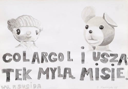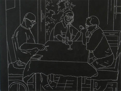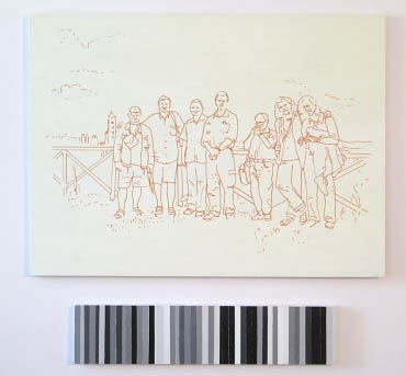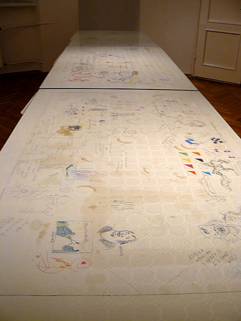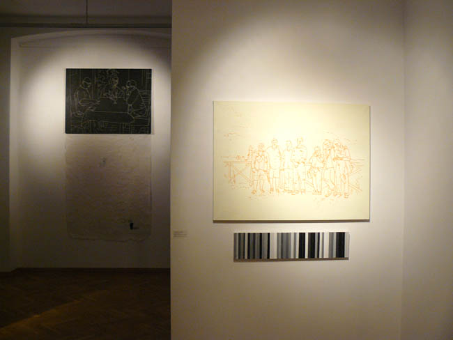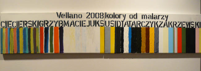 Pejzaż Toskanii, a dokłądnie miasteczka Vellano, dostarczał bodźców artystom do pracy. Powstały zatem tytułowe „obrazy-obrusy” będące autorską interpretacją toskańskiego pejzażu. Rzeczony obrus pojawia się też w przestrzeni ekspozycji, pokryty, nie inaczej, rysunkami - radosną twórczością Włodzimierza Jana Zakrzewskiego. I jeśli by szukać wspólnego mianownika prezentowanych prac, to jest nią wyraźnie wyczuwalna radość tworzenia płynąca ze wspólnego przebywania – rozmowów, dyskusji. Pokazuje to film autorstwa Pawała Susida, dokumentujący zabawne rozmowy twórców luźno związane ze sztuką na tarasie domu w Vellano. A jak powszechnie wiadomo twórcze jest niejednokrotnie dobre towarzystwo w jakim się znajadujemy. W każdym razie artyści, czują się ze sobą znakomicie, co widać na filmie Susida.