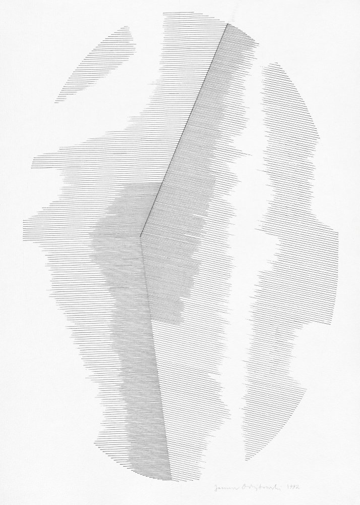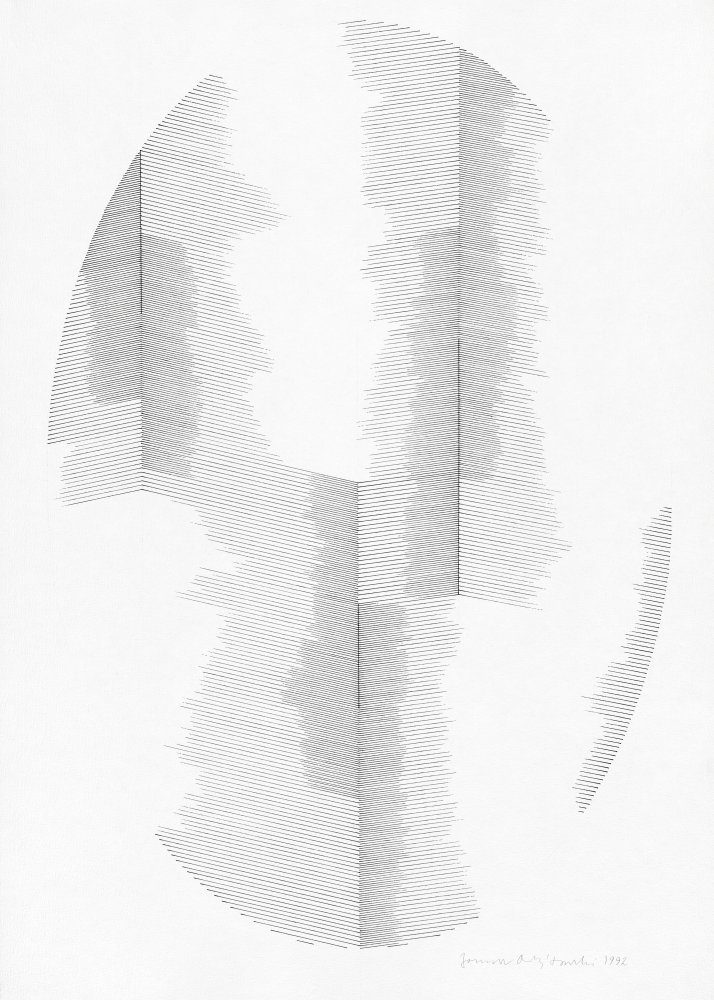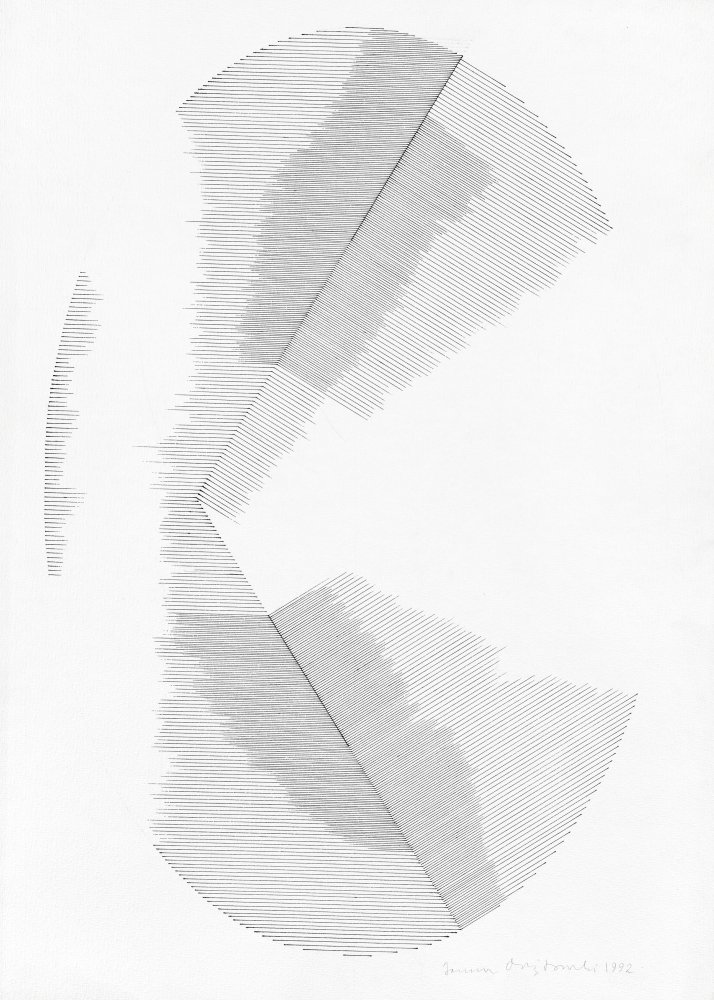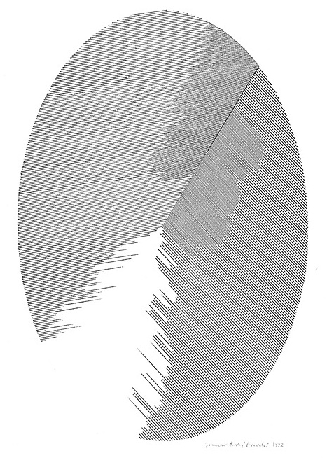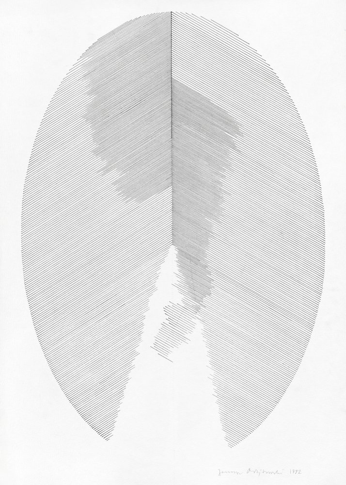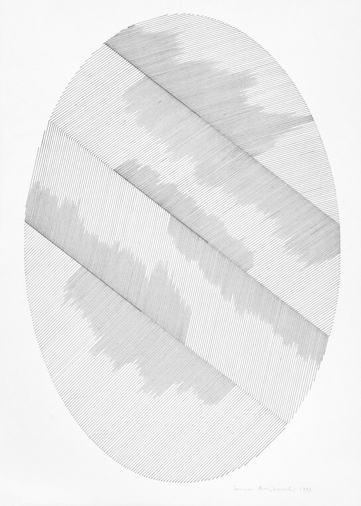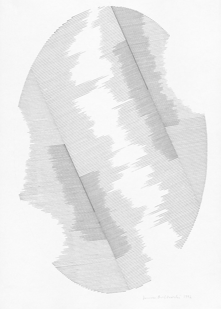 Rysunki czarnym tuszem na białym papierze, to zobaczone w naturze, rytmy biologiczne do samodzielnego odnalezienia według osobistych skojarzeń.