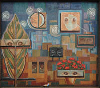 Obserwacja starego, prawie niewidzącego człowieka, przechodzącego przez ruchliwą ulicę nasunęła mi temat „Człowiek z białą laską”, tempera woskowa, akryl. To próba ukazania bioenergetycznej postaci w aktywnej przestrzeni.