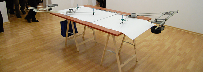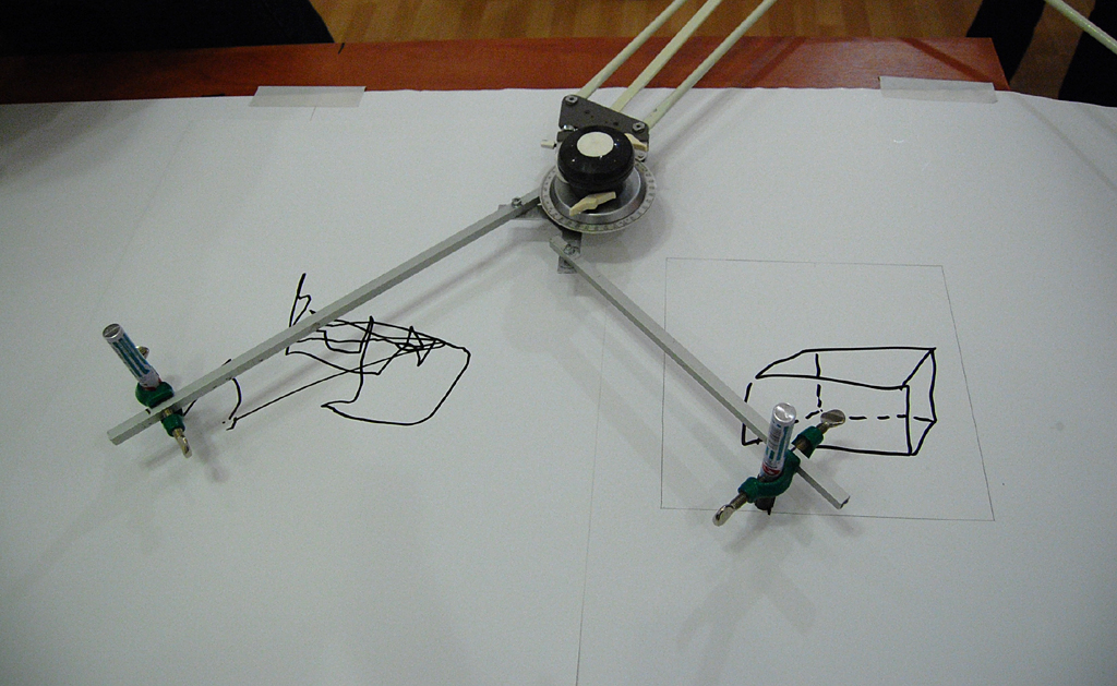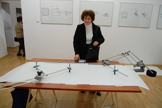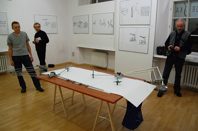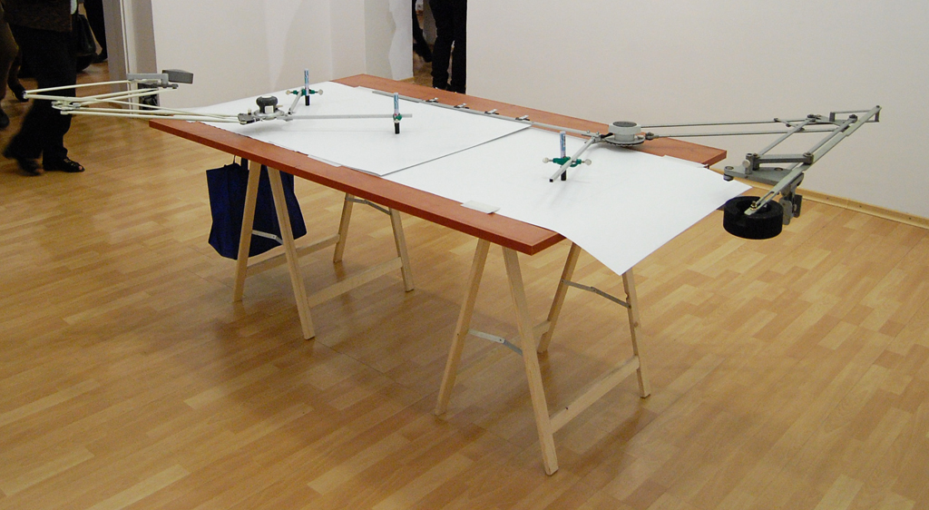 Paweł Kwiek zbudował maszynę do rysowania. Jest to maszyna szczególna. Dwie osoby podchodzą do jakby kreślarskiego stołu. Jedna bierze flamaster i rysuje cokolwiek, druga osoba innym flamastrem także wykonuje rysunek wg własnej fantazji. Między dwoma osobami jest trzecia kartka i trzeci flamaster, który w machinie tworzy wypadkową dwóch rysunków, w ten sposób powstaje międzyrysunek. Drugą technikę opisuje sytuacja "(...) rysujący pisak porusza papierem, na którym rysuje drugi rysownik. Jego z kolei pisak porusza kartką pierwszego. Obydwaj rysują na wzajemnie poruszanych kartkach - powstają od razu dwa międzyrysunki".