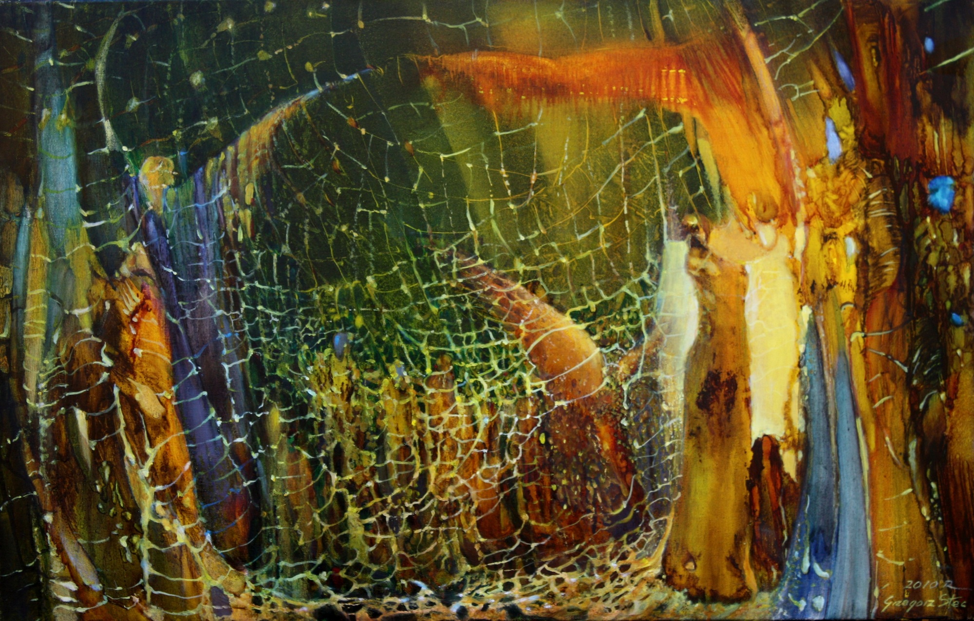 Tytułowa melancholia i maskarada są metaforami dwu różnych, choć mocno splecionych ze sobą, form odczuwania współczesnego świata, obecnych w malarstwie Grzegorza Steca. Melancholia zwiera w sobie smutek, poczucie alienacji i bezsiły, doświadczanie straty i ból przemijania. Maskarada oznacza ucieczkę w karnawał, zakładanie masek, poprzez które człowiek-owad, zaplatany w wielorakie sieci, komunikuje się ze światem. Dzięki światłu, które w malarstwie Steca odgrywa niezwykle ważną rolę, dominuje tu jednak (metafizyczna) nadzieja.
