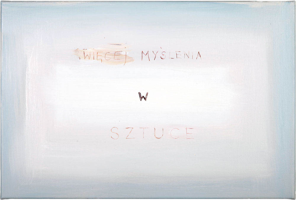 Zaprezentowane na obecnej wystawie obrazy z ostatnich lat (2008–2012) ilustrują ten właśnie, syntetyczny okres twórczości artysty, wzbogacony o nowy akcent, jakim jest umieszczenie w licu obrazu komentarzy słownych, poetyckich tekstów i cytatów wyjętych z potoczności. Równoległe wątki narracyjne, na które składają się wspomnienia z dzieciństwa i wczesnej młodości, postać zmarłego przed rokiem ojca oraz autorefleksje związane z samym malarstwem łączy podobna metoda wypowiedzi: lakoniczne, choć niekiedy bardzo drapieżne, pierwszoplanowe interwencje malarskie rozgrywane są na znajdujących się „pod spodem” jasnych i delikatnych, niemal abstrakcyjnych płaszczyznach malarskiego tła.