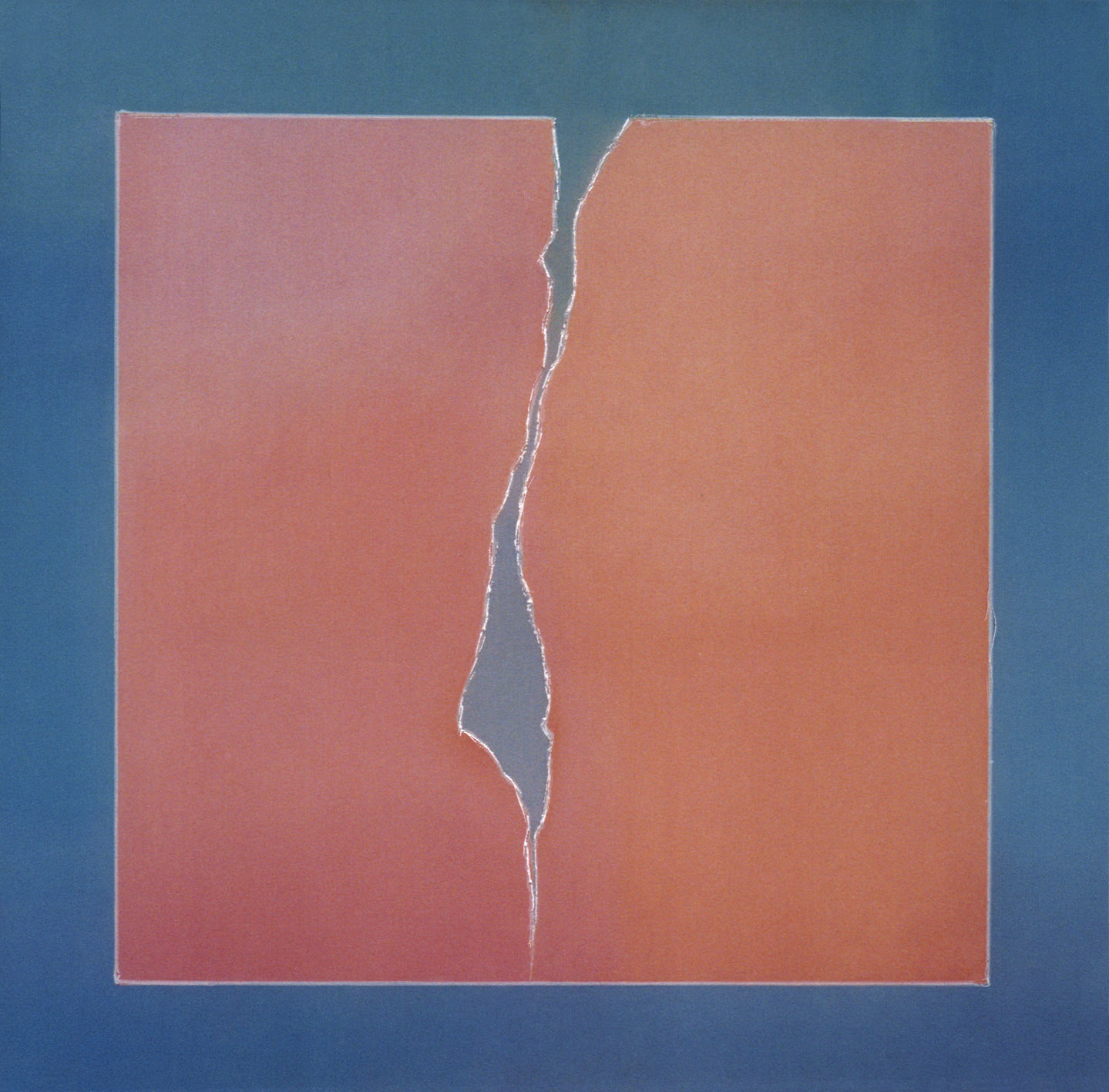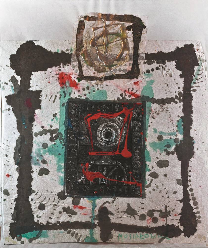 po prawej: Kajetan Sosnowski, Układy równowartościowe, 1982-1987, obraz szyty, 95 x 95 cm