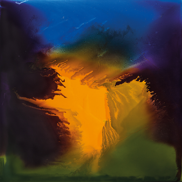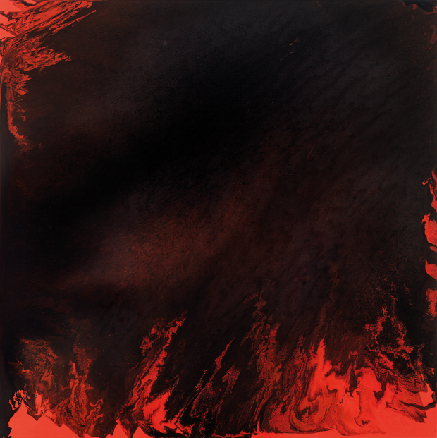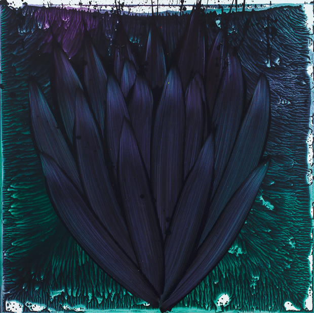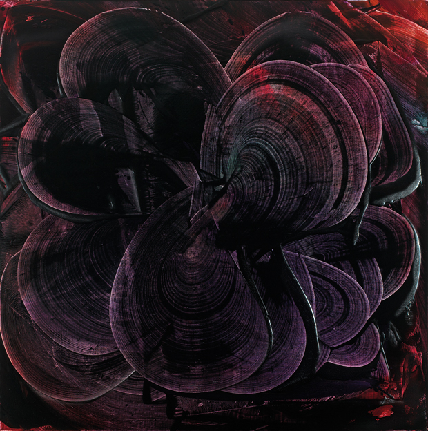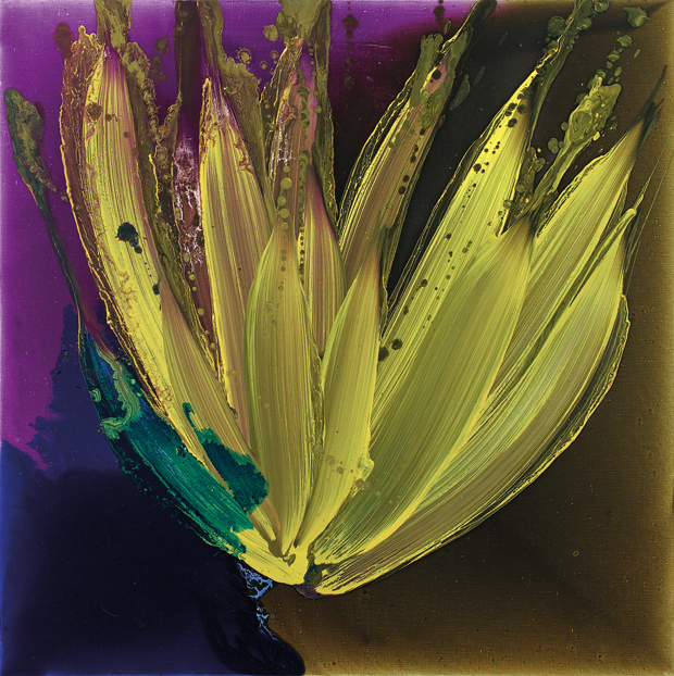 Nadal oglądamy te umowne kwiaty, które zostają rozczłonkowane do form sugestywnych - samych trajektorii pędzla mocno nasączonego barwnikiem. Ale także - rozlania niby lawy, plam niemal kleksowych, rozsmarowania jakby z palety malarskiej, coś co wygląda jak płomienie.