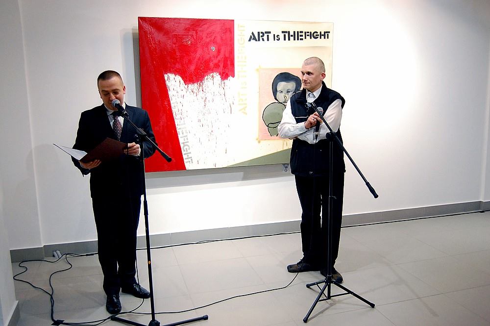 Arena życia. Tematem ostatnich prac Leszka Bartkiewicza jest sport. Wydaje się on brzmieć dość trywialnie, lecz dla artysty to nie przedstawienie zmagań na arenie czy portretowanie współczesnych sportowych herosów jest celem malarskiej praktyki. Sport jest w pewnym sensie hasłem, tematycznym „uszczegółowieniem”, niezbędnym o tyle, że pozwala rozwijać, poszerzać pod względem formalnym, realizowaną od lat ideę dotyczącą przedstawienia postaci ludzkiej. W tym sensie na ostatnie dokonania autora możemy patrzeć jak na naturalną kontynuację wcześniejszego cyklu „Figur kreślonych”. Podobnie bowiem, jak w tamtej serii, również obecnie, Leszek Bartkiewicz podejmuje malarską analizę relacji postaci i tła, dążąc do osiągnięcia plastycznej równowagi między figuracją a abstrakcją, między kształtami geometrycznymi a tymi zaczerpniętymi ze świata natury. Jego obrazy ujawniają pokrewieństwo ze sztuką artystycznego plakatu, co zapewne jest wynikiem wykształcenia artysty. „Plakatowe” spojrzenie pozwala mu ująć malarski żywioł w ramy graficznej dyscypliny. W obrazach często pojawia się liternictwo, litery wykonane z użyciem szablonu, zaś podstawowym środkiem wyrazu jest relacja plamy barwnej i linii. I podobnie jak w plakacie, obrazy Leszka Bartkiewicza przekazują treść w umownej, skrótowej, nasyconej, jakby „hasłowej” formie. Taki sposób obrazowania skutkuje pojawieniem się istotnego rysu dekoracyjnego, a także podkreśla rolę malarskiego warsztatu. Jednak nie tylko tradycja plakatu jest dla Leszka Bartkiewicza źródłem formalnych rozwiązań. Specyficzny sposób kadrowania motywów wydaje się być zaczerpnięty z fotografii, podobnie jak poklatkowe, często nakładające się na siebie, zapisy stadiów ruchu dające wrażenie symultaniczności. Ważną inspiracją jest także dadaistyczna tradycja ready mades. Tworzy obrazy/obiekty. Tym, co może wyróżniać najnowsze prace od wcześniejszych, i co wydaje się być w opozycji do „dynamicznego” tematu, jest dążenie do zrównoważenia kompozycji. Oddając jednak sprawiedliwość „aktywności sportowej”, artysta opiera ten kompozycyjny balans na przeciwstawieniu sobie, wzajemnym „znoszeniu się”, maksymalnych plastycznych napięć - geometrycznego, płaskiego, bądź abstrakcyjnie ekspresjonistycznego tła i dynamiki ludzkich figur, dalej - linii i plam, znaków i rzeczywistych obiektów. Wracając do tematu ostatniej serii obrazów Leszka Bartkiewicza i sięgając głębiej, poza ich stronę formalną, odkrywamy, że temat sportu nie jest dla artysty jedynie pretekstem do ukazania ciała ludzkiego, inspiracją do kolejnych kreśleń figury ludzkiej, ćwiczeń w przedstawianiu możliwych jej form i wariantów. Sport staje się przede wszystkim wyrazistą metaforą współczesnego życia, które oparte jest na rywalizacji, naznaczone wyścigiem ku osiągnięciom, charakteryzujące się zmaganiem, walką. Swoich sportowych bohaterów artysta pozbawia jednak rysów indywidualnych, czyni ich anonimowymi, symbolicznymi, jakby wskazując, że to nie osobowość, lecz osiągnięcie jest tym, co pociąga nas w sportowej rywalizacji. To zapewne dlatego człowiek w jego obrazach staje się „figurą”, „karykaturalnym emblematem”, „ludzkim znakiem” przedstawionym za pomocą dekoracyjnej plamy czy plątaniny linii. Wyczuwalne w obrazach dynamiczne napięcia i zderzenia skłaniają do odczytań, że współczesny „sportowy” człowiek zamknięty zostaje w ograniczającą przestrzeń życia sportowej arenie, podporządkowany regułom walki i poddany presji zwycięstwa, pozbawiony naturalnej spontaniczności i radości. Deformacje ciał atletów wskazują na groteskowość tej sytuacji. Jednak nie czytamy tego malarskiego przesłania jako trudnego czy bolesnego, raczej jako informację, diagnozę podaną w atrakcyjnej formie. Artysta wydaje się stać z boku i patrzeć na „arenę życia” z chłodnym dystansem. Czy jest to wyraz ukrytej krytyki czy może jednak cicha zgoda na „sportowy” stan rzeczy? A może raczej wskazanie, że również sztuka stała się sportową areną, na której liczą się jedynie osiągnięcia, wyniki, konkursy, rankingi? Artysta milczy, nie daje jasnych odpowiedzi czy chociażby nikłych wskazówek.