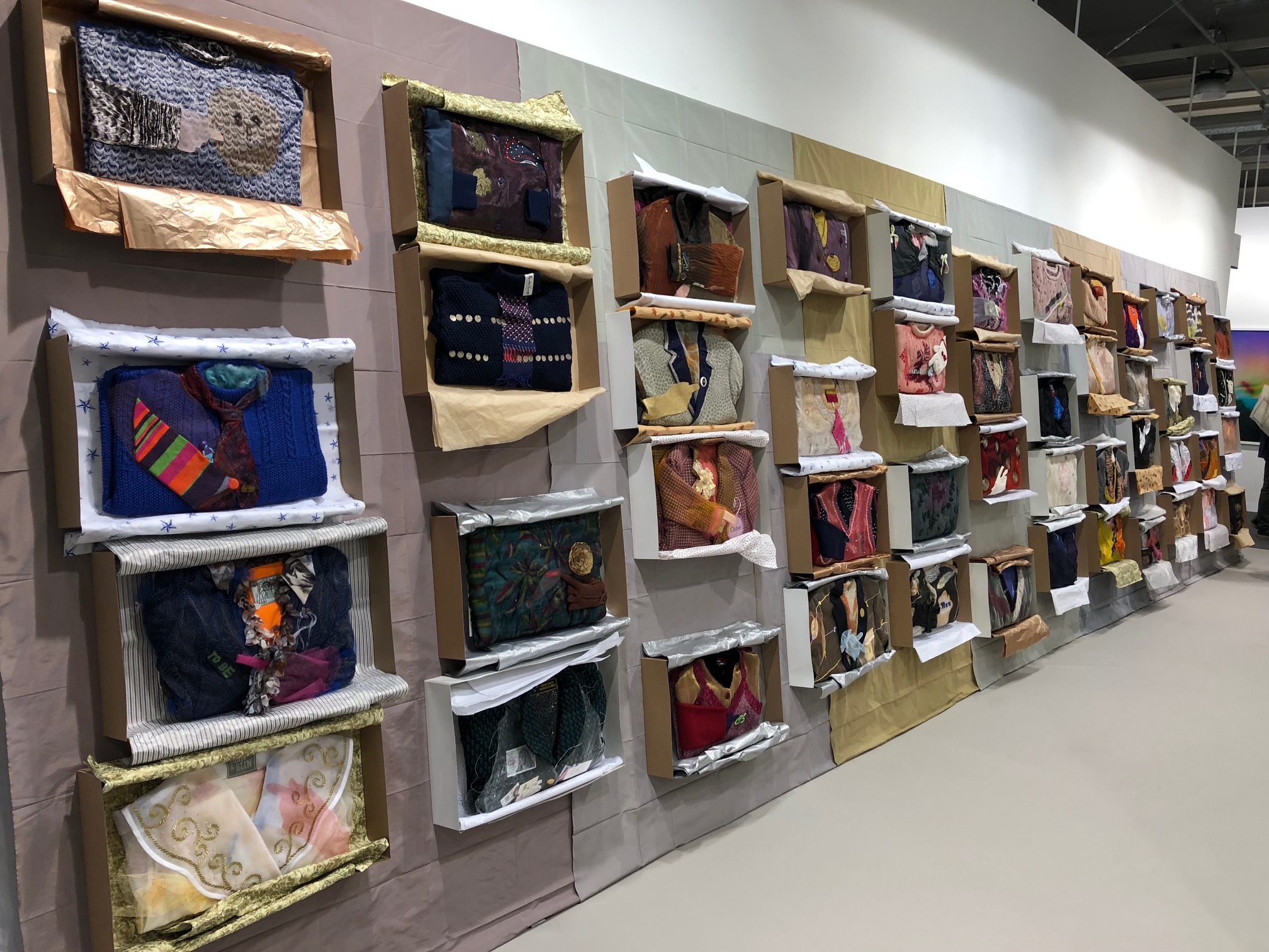 Liz Magor „Being This” zapełniła natomiast całą ok 10 metrową ścianę pudełkami, w których umieściła złożone i gotowe do kupienia / sprzedaży ubrania z second handów. Każdy egzemplarz miał tak zagięty mankiet rękawa lub w ten sposób dołożoną rękawiczkę, aby wskazywał bezpośrednio na metkę z nazwą firmy, nierzadko bardzo znaną, jak Chloe, czy Miu Miu. „Being This” obiecuje tytuł pracy. Będziesz tym co założysz i skonsumujesz. Kim chciałbyś dziś się stać? Wybierając produkt zakładasz maskę, która zakryje twoje prawdziwe ja i będziesz nadal bezpieczny. Kup sobie bezpieczeństwo, wygodę. Nie ważne jest samo ubranie, praca. To co się liczy to metka i to kim ona Cię uczyni.