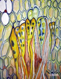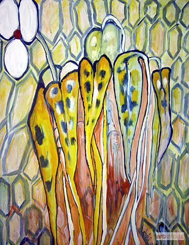 On each painting , which is always a flower or a plant composition - joyful figures, characters can be found, as well as nudes, woodland or city scenery. The clarity of colour used by Tadeusz Dębski makes his works very decorative and delightful.